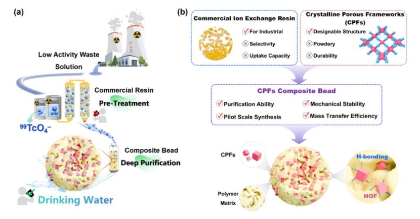 面向痕量核废水净化需求及粉体材料规模化应用瓶颈,天津师范大学化学学院李程鹏教授团队通过造粒成型策略,将功能化晶态粉末(PG-HOFs、P-COFs和P-MOFs)与高分子基质复合,成功制备了用于捕获放射性核素阴离子(99TcO4–)的34种晶态多孔框架复合珠(CPFs Beads),有效提升了其在连续流、复杂废水体系下的实用性能。该成果以“Facile structuring of crystalline porous framework beads for deep purification of nuclear wastewater”为题,于2025年3月5日发表在National Science Review上。
