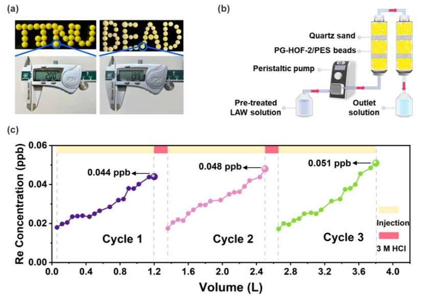 为验证其实际应用潜力,研究团队进一步开展了动态吸附柱实验。结果显示,1.0 g PG-HOF-2/PES复合珠可连续处理4.8 L预处理低放废液(LAW),净化后Re/Tc浓度远低于世界卫生组织(0.159 ppb)规定的饮用水标准,仅为商业树脂处理后核素浓度的千分之六(同等条件下,溶液经商用树脂Purolite A530E处理后,残留Re浓度为8.498 ppb)。更为关键的是,PG-HOF-2/PES复合珠经多次吸附-脱附循环后仍保持稳定吸附性能,凸显了其在真实废水处理场景中的应用可靠性。此外,该研究中的所有CPF-X/PES复合珠对预处理废液的净化效果均显著优于原始粉体材料,证实了该策略的广泛适用性。